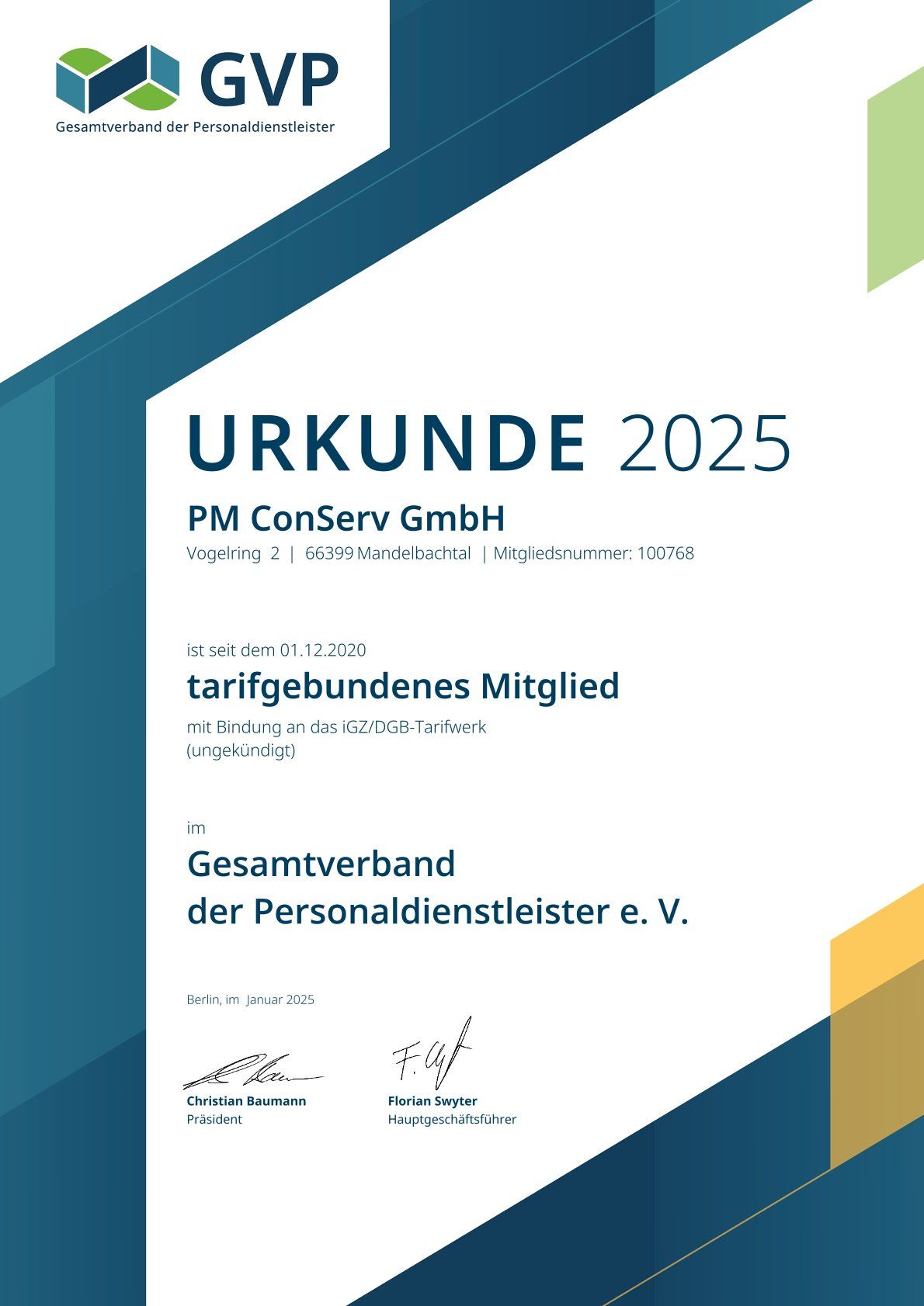 Wir sind Tarifmitglied im "GVP" und bieten unseren Mitarbeitern eine faire Vergütung mit zusätzlichen übertariflichen Leistungen. Ihnen als Kundenunternehmen bieten wir einen fairen Überlassungspreis und zahlen unsere übertariflichen Leistungen im Zuge der in unserem Unternehmen gelebten Wertschätzung selbst an unsere Mitarbeiter aus.